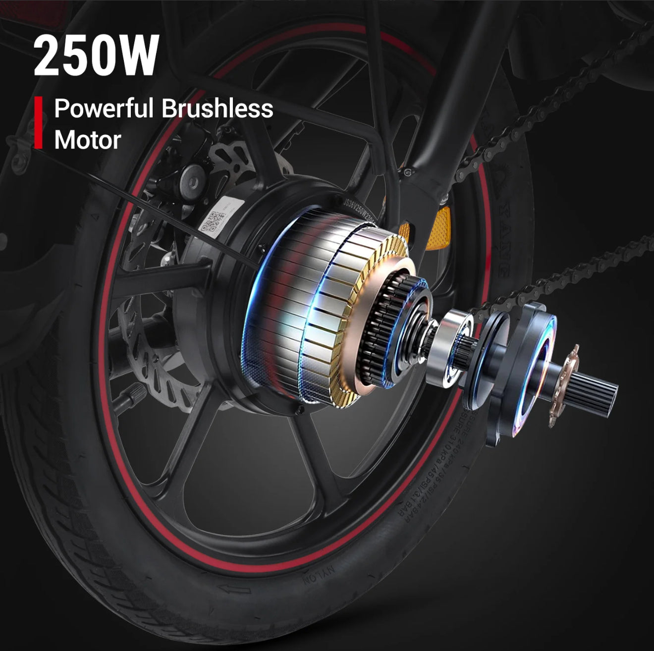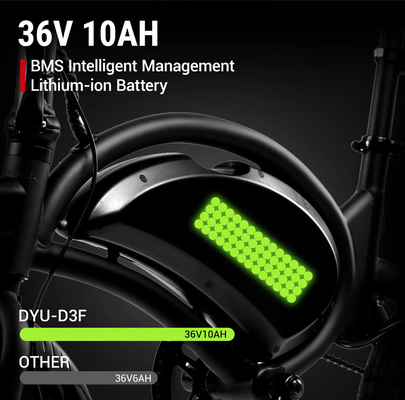 - 250W motor, 36V 10Ah battery. Maximum range up to 60KM.